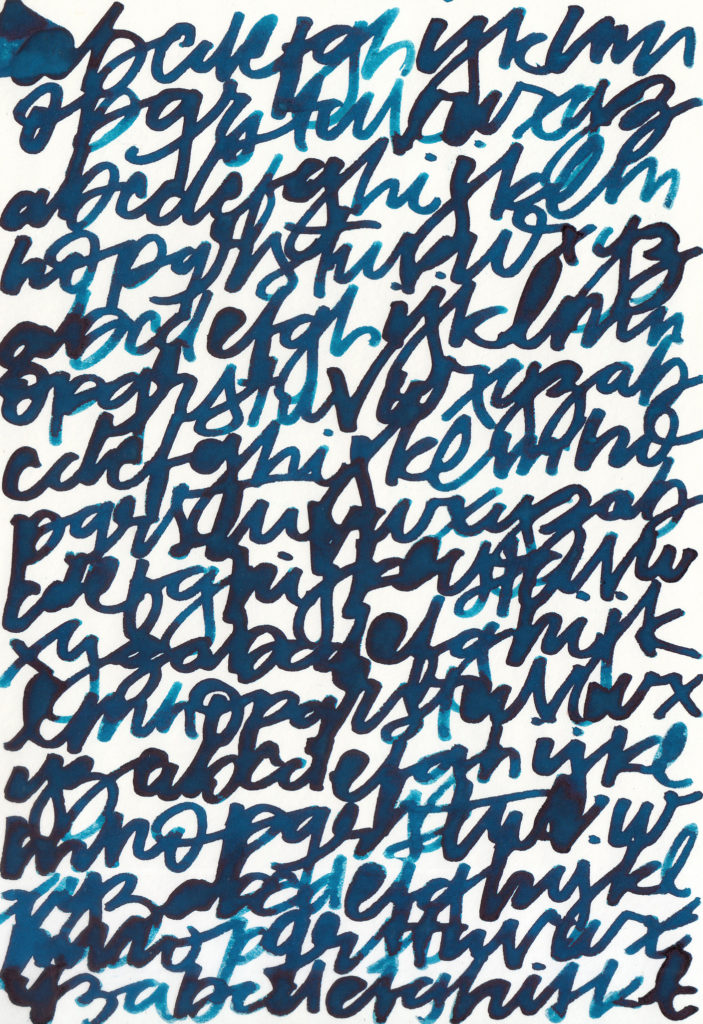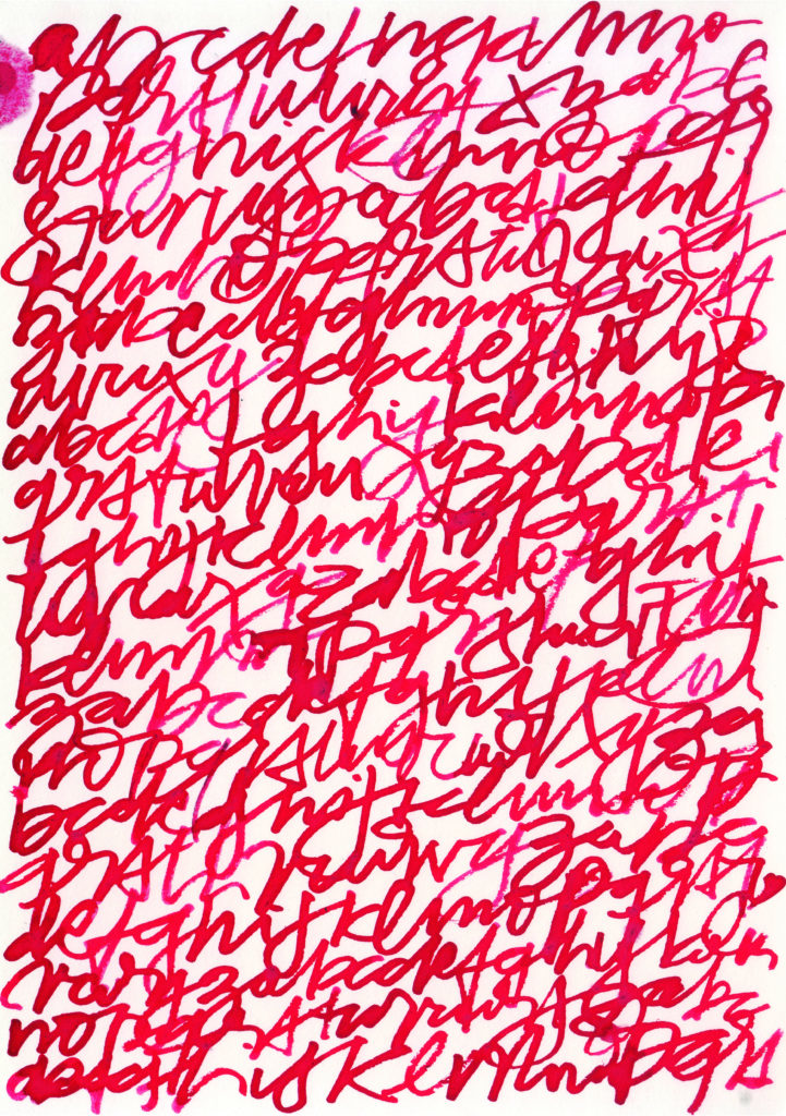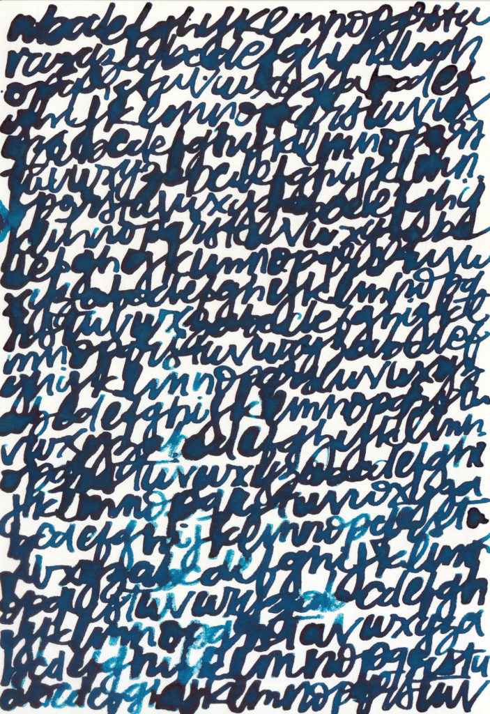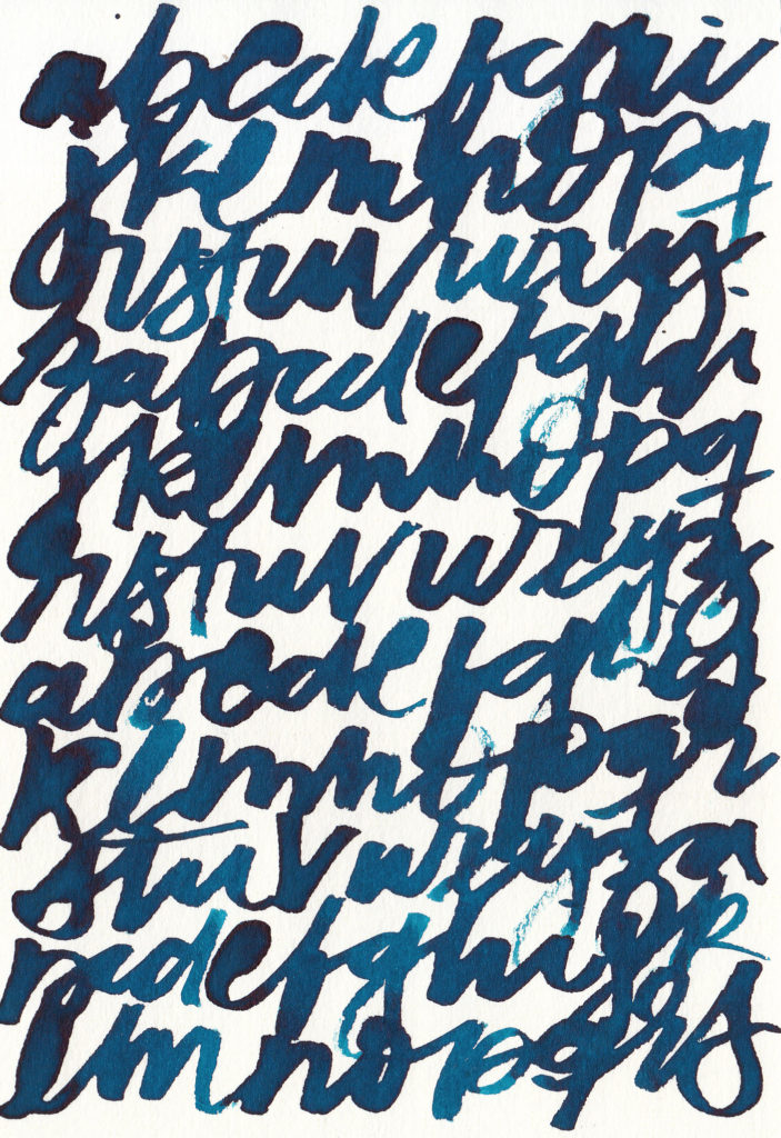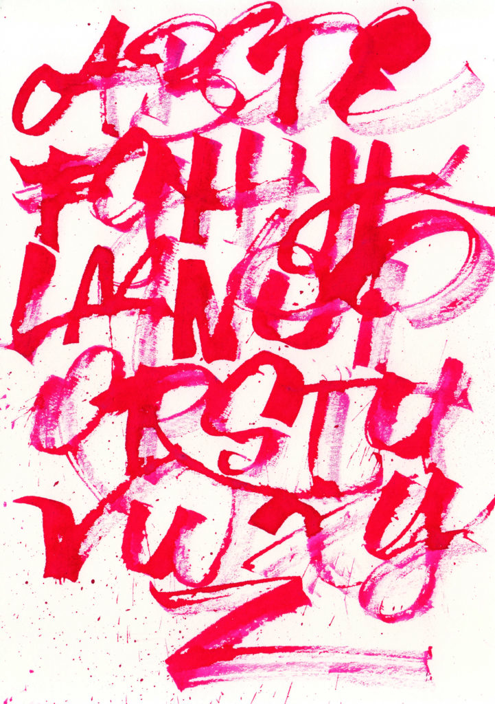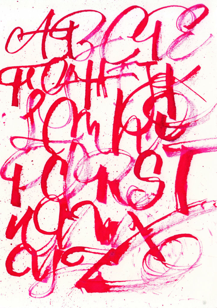 Primera prueba de texturas de alfabetos con plumas rústicas fabricadas a partir de ramitas y cañas encontradas en la naturaleza. El ejercicio consta en escribir alfabetos gestuales con diferentes grosores de trazos para conseguir texturas variadas.